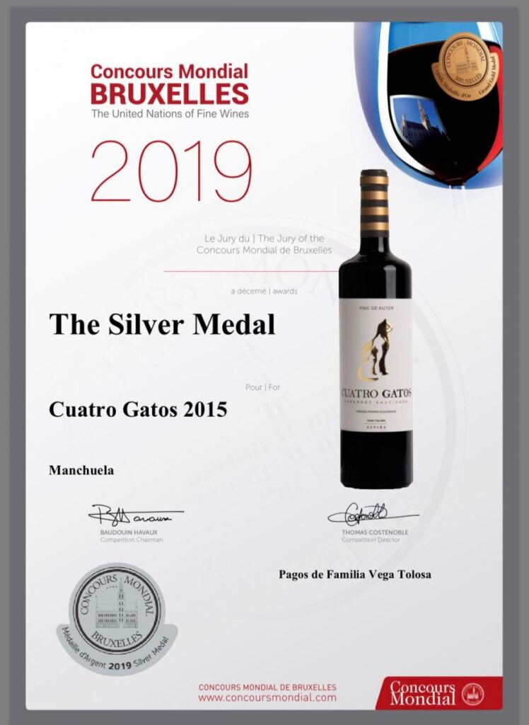 Cuatro Gatos de cabernet-sauvignon 2015 ecológico y acogido a Denominación de Origen Manchuela ha recibido una Medalla de Plata.